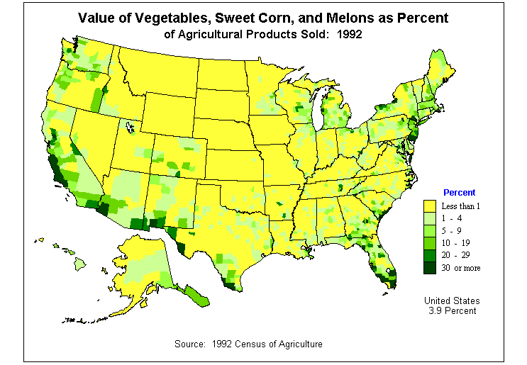 14. Value of Vegetables, Sweet Corn, and Melons as Percent of Agricultural Products Sold: 1992?